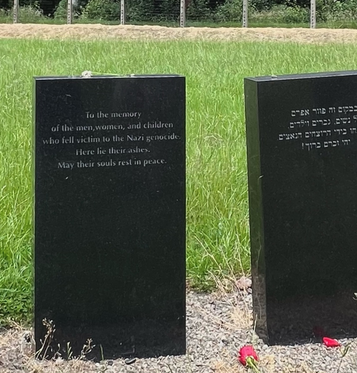 “To the memory of the men, women, and children who fell victim to the Nazi genocide. Here lie their ashes. May their souls Rest In Peace.”